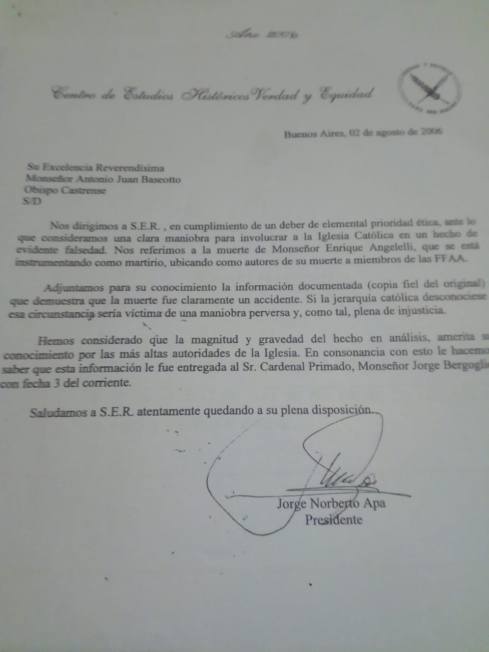 - Una fotografía de la Carta que le mandara a Monseñor Baseotto, en 2006, el Centro de Estudios Históricos Verdad y Equidad; y que, también, le enviara al entonces Arzobispo de Buenos Aires, Cardenal Bergoglio, ante la que hizo caso omiso, pues en sus planes ya estaba, como pudieron leer ayer, beatificar al obispo colaboracionista con los terroristas marxistas, como por fin va a hacer.