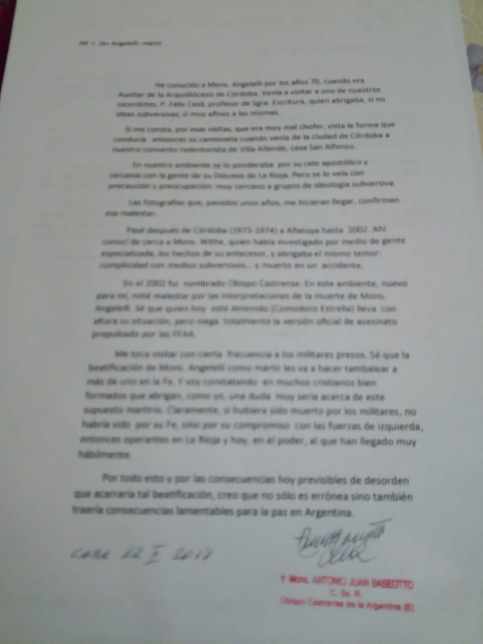 EXCLUSIVA – Aquí va lo prometido ayer: Monseñor Baseotto también rechaza la “beatificación” de Angelelli; primicia que les aportamos junto a inéditos documentos de alcance