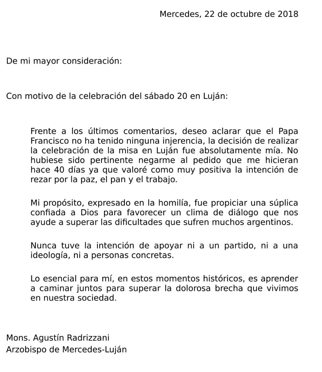 Después del escándalo de celebración eucarística realizado, del mitín político que fue la homilía, y de la utilización de Luján para las soflamas marxistas, ante algunas quejas, Mons. Radrizzani se ha apresurado a hacer «Aclaración» sobre este acto político con el opositor gremio de camioneros, «disimulado» con una Misa, que ha sido una muestra más de la acción del del deplorable episcopado argentino, servil al francisquismo y al Nuevo Orden Mundial.