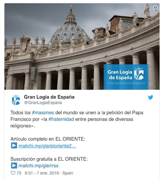 Aquí tienen, sin ir más lejos, imagen del Tweet de la gran Logia de España, que remite a la web “EL ORIENTE” de la masonería donde se difunde todo este panegírico al mensaje no católico, y de “libertad, igualdad y fraternidad” dado por Bergoglio en la “celebración” de la Natividad de Nuestro Señor Jesucristo. Cada vez con más fuerza en los dañinos discursos de Francisco, un “profeta más” de la paz y la fraternidad entre los hombres
