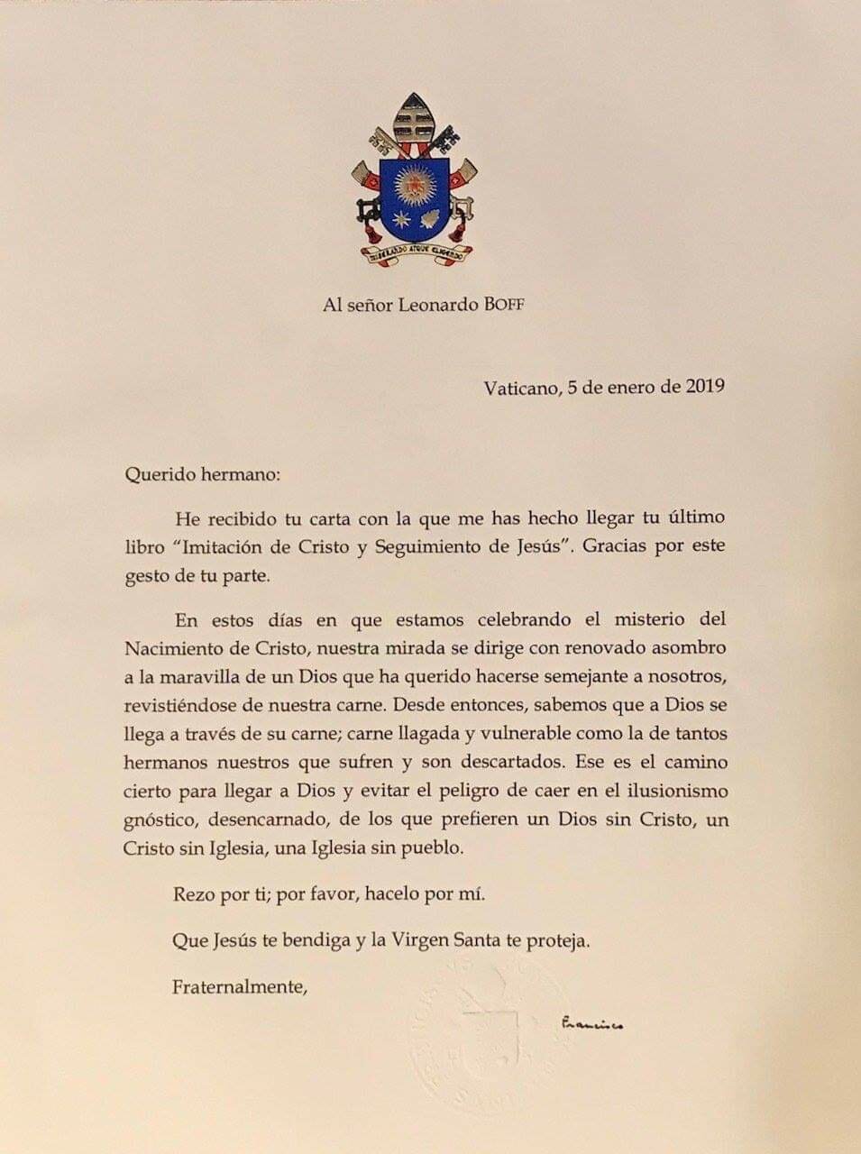 Sale a la luz una nueva carta de Francisco a Leonardo Boff, uno de los teólogos marxistas padres de la teología de la liberación; lo que sigue poniendo de manifiesto la relación de cercanía existente entre Bergoglio y el teólogo brasileño. El motivo de la carta, fechada el 5 de enero, es agradecerle la anterior de Boff, junto a la que le enviaba su último libro, “Imitación de Cristo y Seguimiento de Jesús”.