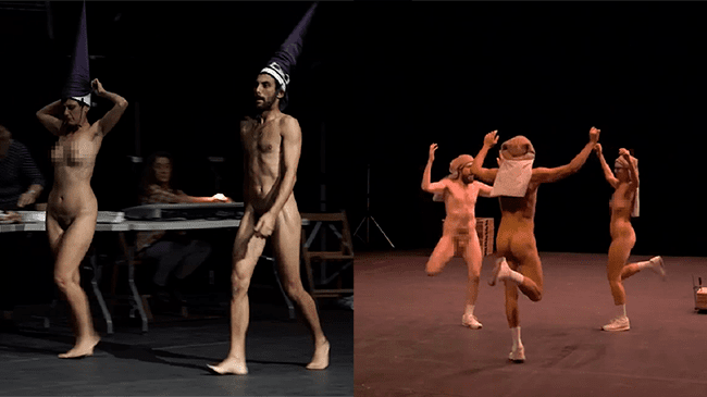 En la obra salen los actores desnudos representando procesiones de Semana Santa y burlándose de las costumbres católicas.