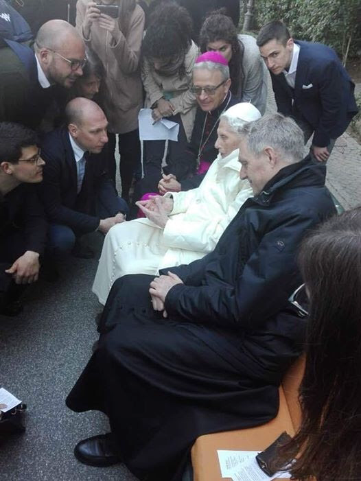¡Menuda diferencia con el arrabalero Bergoglio! Qué tal su último numerito con el anillo. Menuda diferencia de dignidad y de porte y no digamos de nivel teológico ..