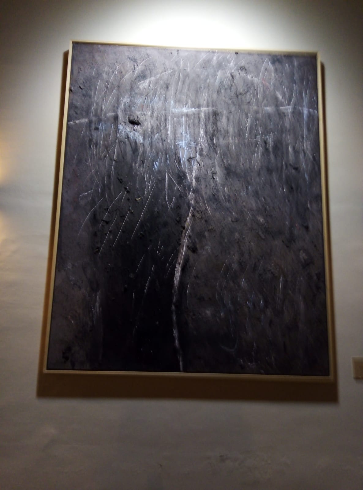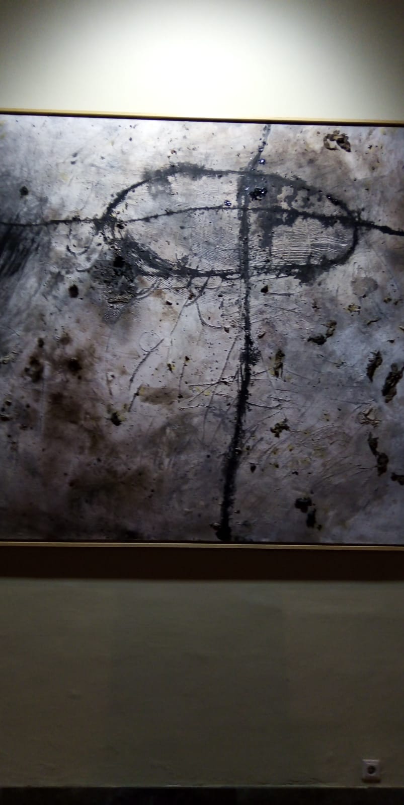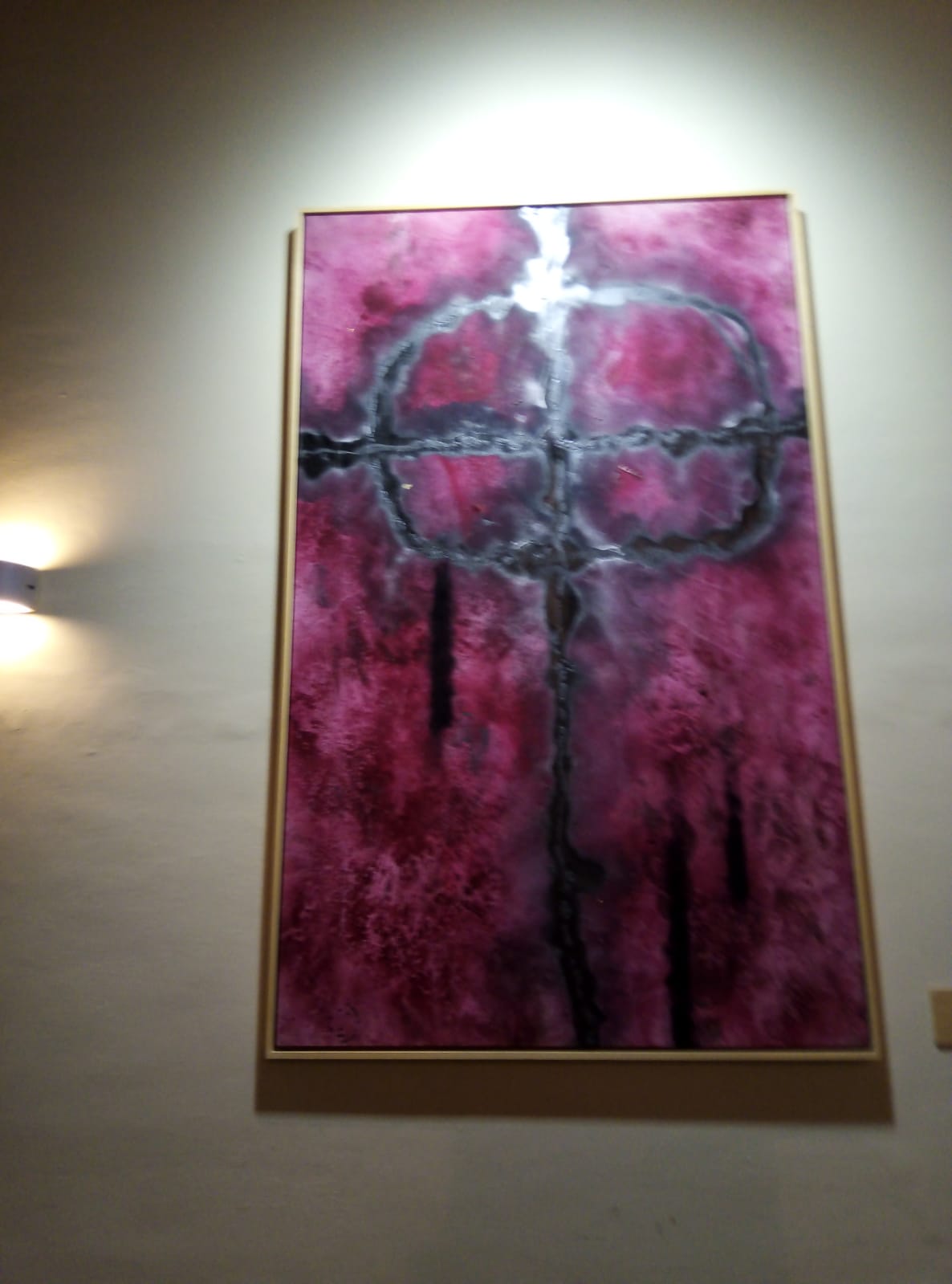 Esos cuadros (reflexiones sobre la cruz) están desde hace 7años al menos y aunque son modernistas, no tienen nada de tétrico. A no ser que la cruz se lo parezca