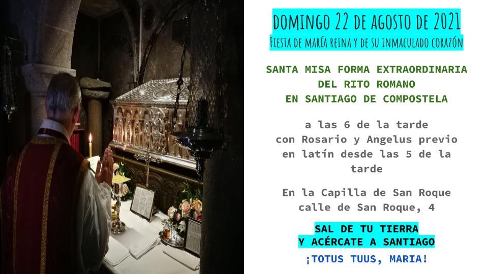 Tenemos la gran dicha de anunciar que la Santa Misa Tradicional se celebrará a partir de este mes de agosto una vez al mes en Santiago de Compostela. Este domingo, 22 de agosto tendrá lugar la primera celebración en la Capilla de San Roque (calle de San Roque, 4) a la 6 de la tarde. Antes de la Santa Misa se rezará en latín el Santo Rosario y el Ángelus desde las 5 .