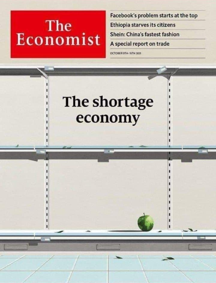 La revista “Economist”, que es propiedad de la élite mundial, acaba de sacar esta portada donde vemos una estantería de supermercado completamente vacía.