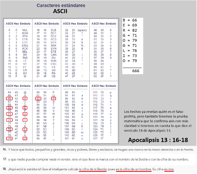 Llegados a este punto, antes de proseguir con el relato, diré como aclaración previa necesaria, que hace un tiempo me di cuenta de algo impresionante relacionado con el apellido del antipapa usurpador de la silla de Pedro que dio un golpe de estado en contra de Benedicto XVI. Resulta que Bergoglio, y además en mayúsculas, es decir, BERGOGLIO, suma 666 (seiscientos sesenta y seis) en código ASCII (*1). Los creyentes que nos consideramos parte del Remanente Fiel hace tiempo que sabemos que este antipapa es el falso profeta que en el capítulo 13 del libro del Apocalipsis de San Juan es mencionado como la bestia que sale de la tierra, que habla como dragón, que induce a pobres, ricos, libres y esclavos a que se pongan una marca en la mano derecha o en la frente sin la cuál nadie pueda ni comprar ni vender, y cuya cifra es la de un hombre, que ésta es 666 y que la calcule quien tenga inteligencia para calcularla. Creo que es innegable que estos versículos parecen definir con claridad a la figura del falso profeta, ya que además de ser un hereje con cientos de herejías gravísimas documentadas en su haber, éste también induce a la gente a inocularse un experimento transgénico que si no te pones, eres excluído del sistema y no se te da el pasaporte que te permite comprar o vender. Esto queda de hecho muy claro en un famoso y espantoso video en el que este sujeto dice que vacunarse es un acto de amor.