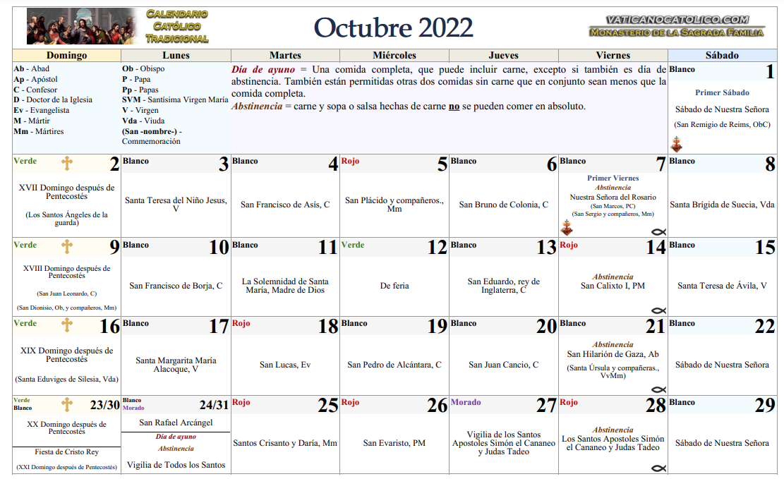 CALENDARIO LITÚRGICO TRADICIONAL OCTUBRE 2022