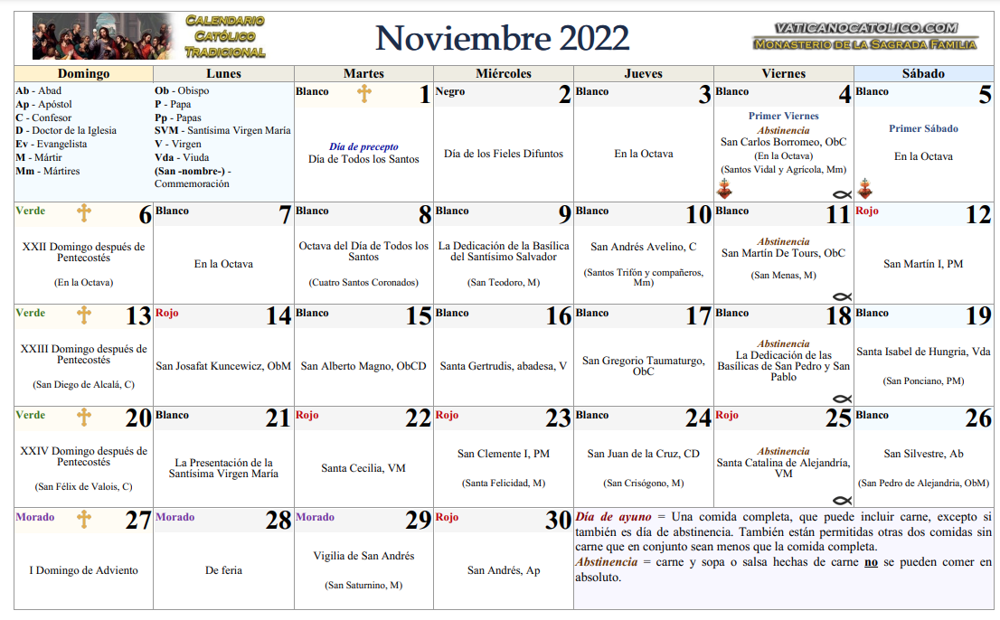 CALENDARIO LITÚRGICO TRADICIONAL NOVIEMBRE 2022